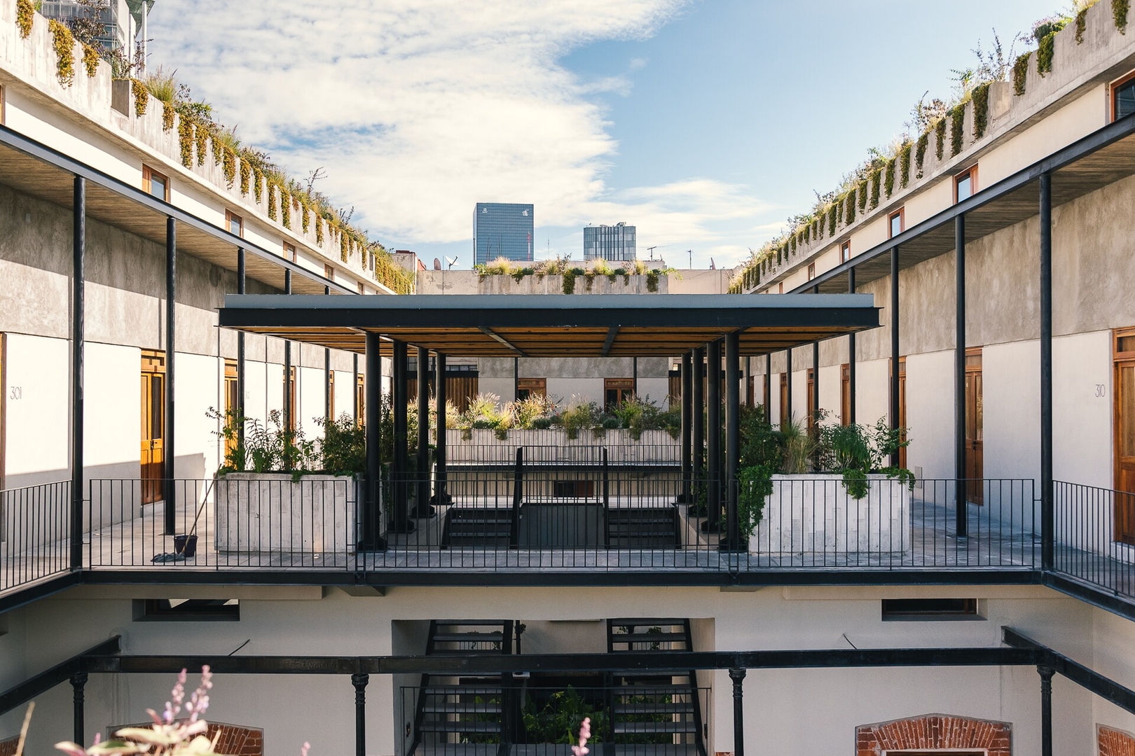 The entire common-areas of the building are accessible to guests. There is a staircase in the second “patio” of the building that leads to a stunning terrace with a beautiful garden, and a panoramic view to the modern Mexico City skyline. There are several bike parkings.